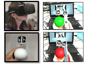 遠隔地間で仮想的に環境を共有している状況で,相手が指さししているものを分かりやすくする手法について研究しています.左の画像では,上が遠隔地の対話者の手を表示しており,下は自分の手になります.